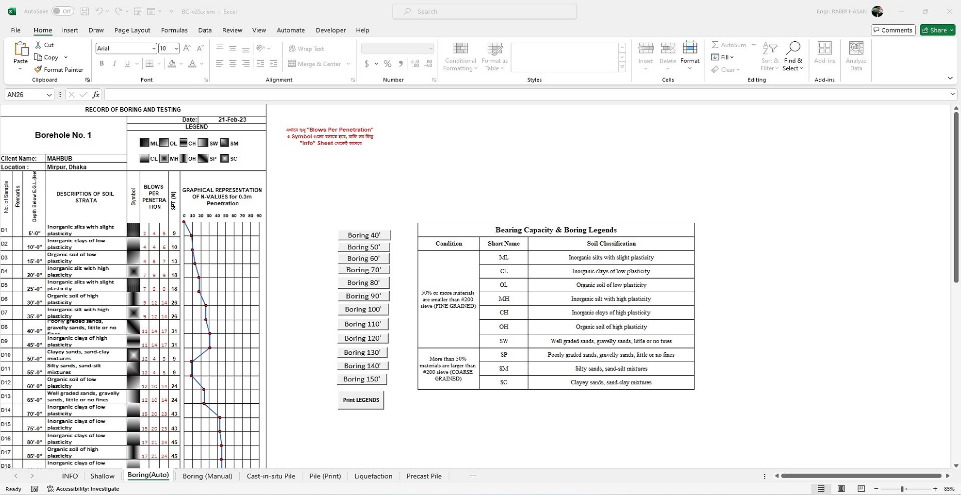 Up to 6 boring at a time- 20 ft for shallow & 150ft for pile foundation.